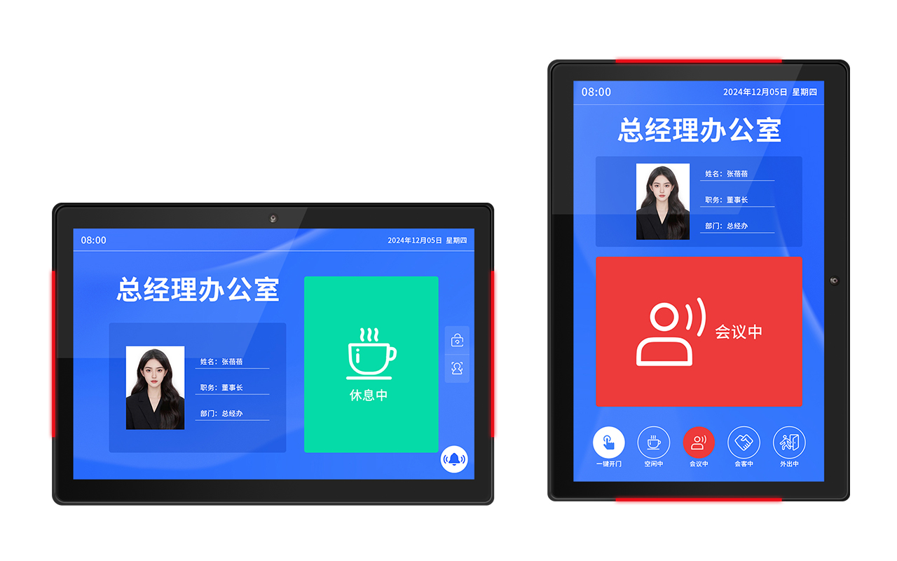 从外观形态而言,亚云智显电子门牌摒弃了传统纸质或塑料门牌的静态、单调,以轻薄精致的显示屏华丽登场。不仅画质细腻清晰,色彩明艳饱满,更以高亮度与广视角确保信息在各种光线条件与不同观测位置都能精准传达。从会议室到办公室,从经理室到公共区域,其时尚简约的设计风格恰似灵动音符,与现代化办公装修相得益彰,和谐融入整体环境,成为室内美学不可或缺的点缀,一改往昔门牌的沉闷形象。