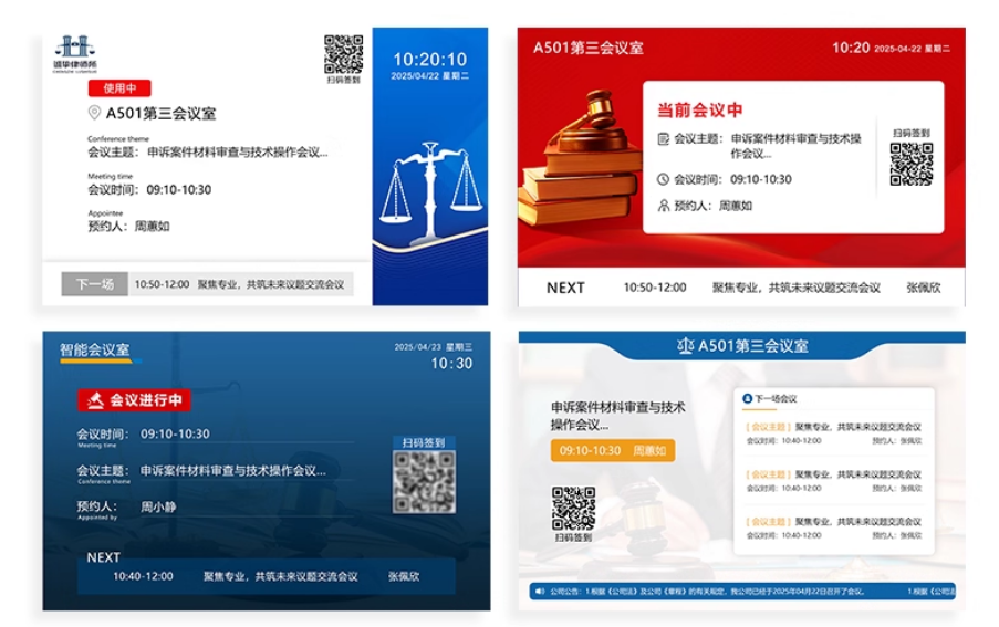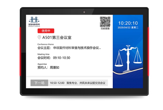 预约操作也很方便,它能和所里的办公系统联动,比如泛微、OUTLOOK、钉钉企微等,律师们用手机、电脑随时能看状态、约会议室。有些带触摸屏的,没带设备时也能临时去触摸操作,预约、取消都很简单,不会因为系统不同步出乱子。